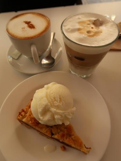 私たちは散々迷いましたが、凝ったフレーバーのものより原点に戻ろうと、ヴィーガン・アップルパイにバニラ・アイスを添えたものと、後はそれぞれカプチーノとアイス・カフェラテにしてみました。