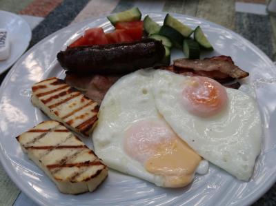 これは、焼きソーセージ、目玉焼き、焼きハル―ミ(キュッキュッとした食感が楽しいチーズの一種)にサラダやパンが付いて来るもの。