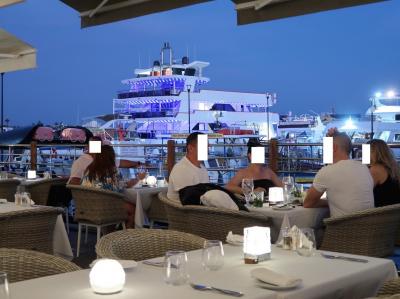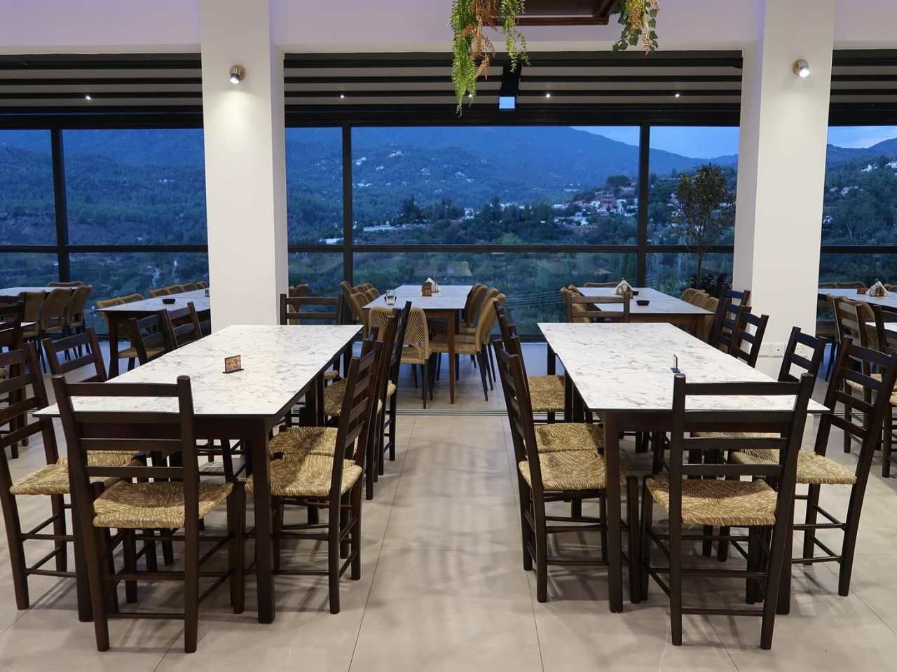 - テラス席からはトロードス地方の山並みが見渡せます。ランチか早めの夕食でどうぞ。