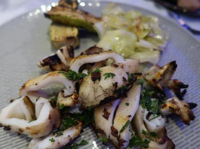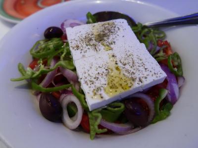 それにフェタチーズを乗せたギリシア風サラダ、白身魚のスブラキ(串焼き)、イカのグリルを頼んでみました。