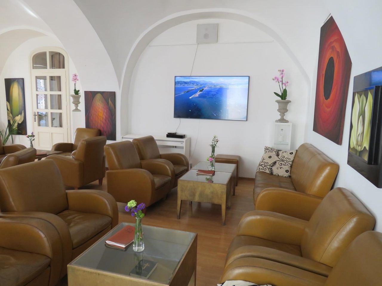 - ミニ・ギャラリーや花、ベンチが並んでいて洒落た雰囲気