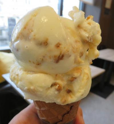 私たちはパフェのようにガラスの食器に盛られたものを試してみたかったんですが、席が空きそうもなかったので、コーンとカップ入りのものをオーダーしてみました。