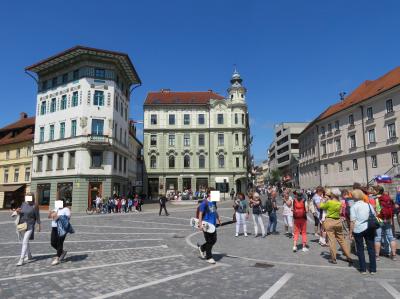 三本橋トロモストウイエや聖フランシスコ教会などがそばにあるプレシェーレノフ広場(プレシェーレン広場)は、直径が100mほどの円形の石畳の広場で、リュブリャナの観光の基点。