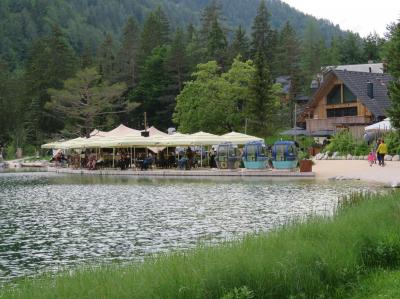 ホテルそばの湖畔には、湖にせり出すステージ風にしつらえられたカフェ・バーがあり、お天気さえよければ上記の風景が楽しめて雰囲気抜群。