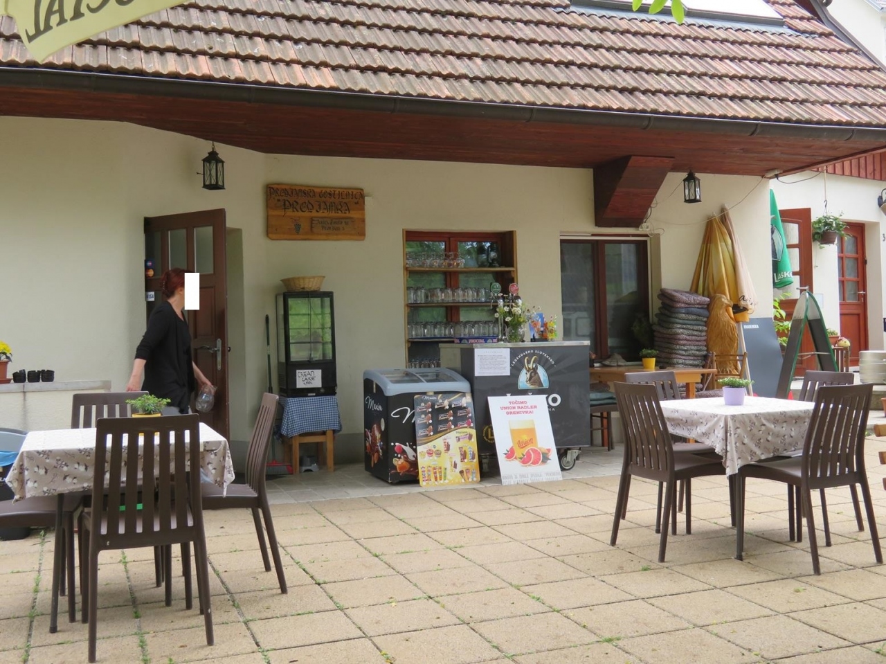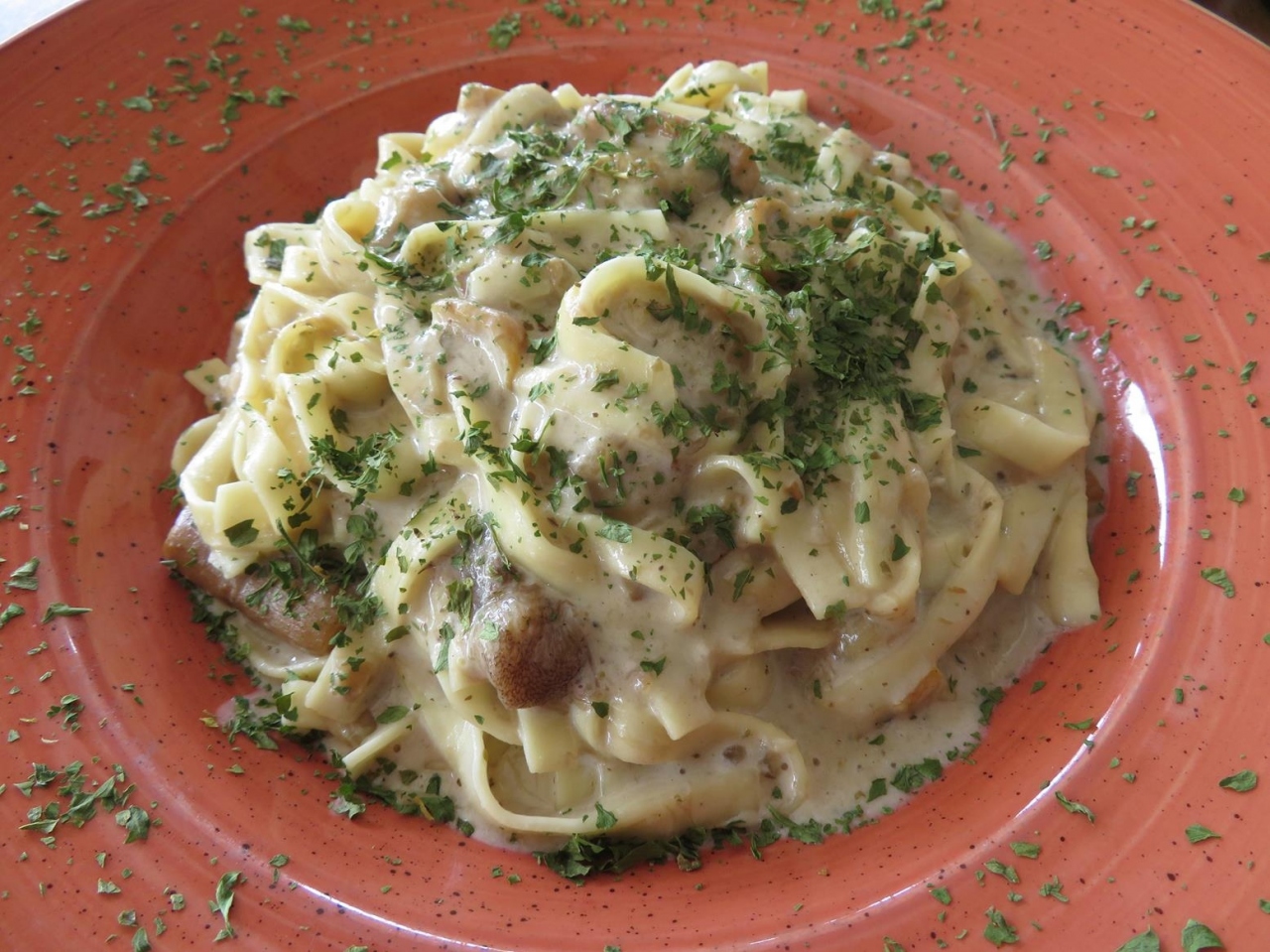 スロベニアの内陸部では、キノコを使った料理やソーセージがおいしいと聞いていたのを思い出しつつ、英語表記もあるメニューを見てみたら、キノコのクリームソース・パスタや茹でソーセージがあったので迷わず注文。