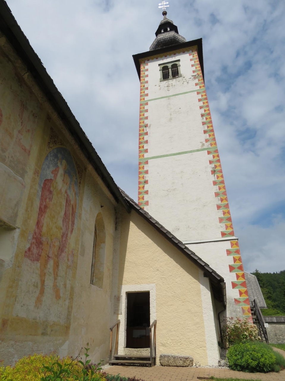 ボヒン湖東端に立つ洗礼者ヨハネ教会。内部の祭壇やフレスコ画が見応えあり