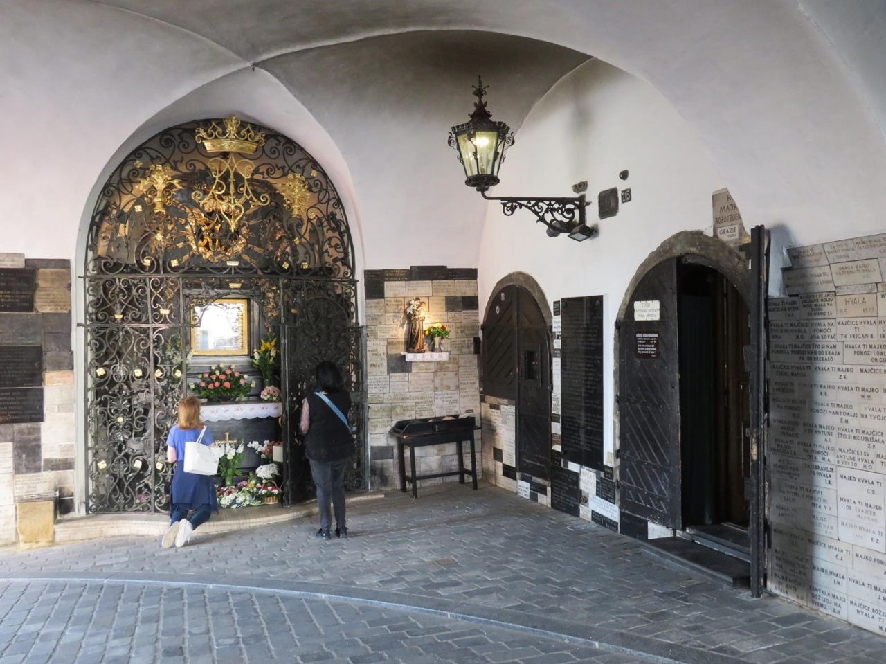 この門は単なる城門ではなく、カーブした短いトンネル状になった内部は聖母マリアを祀った礼拝堂にもなっていて、地元の人々がお祈りにやって来ます。