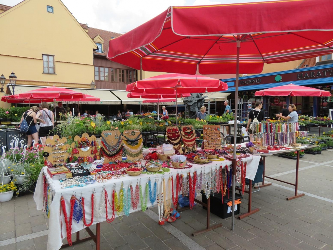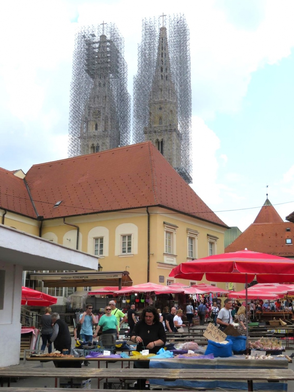 聖母被昇天大聖堂や聖マリア教会の塔が見える広場に1926年からあるこの露天の青果市場は、ザグレブでは一番古い市場。