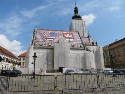 屋根の装飾が印象的な教会で、向かって左側にはクロアチア王国やダルマチア地方、それにスラヴォニア地方を表す紋章、向かって右側にはザグレブ市の紋章が鮮やかに浮かび上がっています。