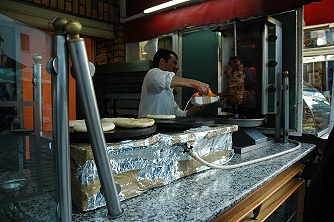 ギリシャやトルコでもよく見かけるようなギロス。厚めにスライスした羊肉を重ねて固まりにしたものを画像のように焼いて売っています。焼けた外側の肉を削いで、そばの鉄板で焼いたピタ風のパンに野菜やピリ辛ソースと一緒に挟んでくれます。このパンがピタとはちょっと違ってモチモチした食感。スースのメディナの外側にある広場に屋台が並んでいます。一人で一つ食べれば結構お腹がいっぱい。1ディナール台という値段もうれしい。