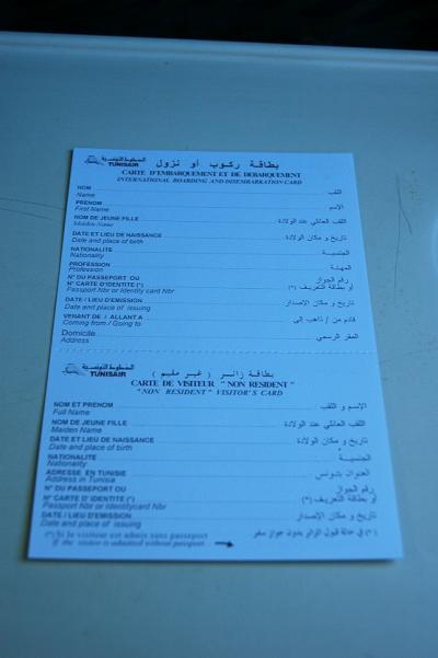 入国の際に記入するカードは、出国カードも下半分についているだけのもので簡単。名前(結婚前の名前も)、出生年月日と出生地、国籍、職業、パスポート番号と発行地、チュニジアに来る前と出国先の国名、住所だけ。税関関係や健康に関するカードはありませんでした。- 旅行時期