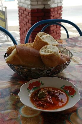 大きいレストランでも小さい食堂でも、食事を頼むとまずフランスパンと付け合わせのオリーブ+チリ・ソース(お店によってチリ・ソースはそれぞれ味が違い、缶詰のツナも付いてきたりします)が出てきます。