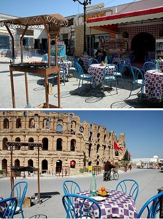 円形闘技場の入り口がある半円形の階段の上に何軒か食堂が並んでいます。お店の名前は出ていなかったのですが、この画像の食堂はお勧め。お天気がよければ、外の席で円形闘技場や行きかう人々の様子を眺めながらの食事休憩が出来ます。画像をクリックすると拡大表示されます。