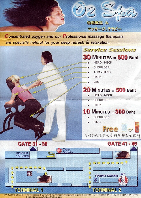お土産屋や免税店がずらりと並ぶ通路には、マッサージ店もちらほら。市内のお店より高いですが、出発便が遅れた時など利用してみるのもいいと思います。画像のものはO2 Spaというお店。画像をクリックすると拡大表示されるので、料金や場所はそちらをご参照ください。