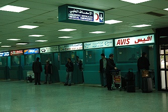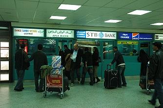 思ったより小さいチュニスの国際空港。到着ロビーに出ると目の前に2階に上がる階段があり、その後に画像のように銀行の窓口がずらりと並んでいました。レートはチュニジア国内各地よりもよかったです。