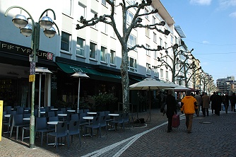 ショッピング歩行街ZEIL の西外れHAUPT-WACHE駅から、さらにALTE OPERに続くFRESSGASSEは名前の通りカフェやレストラン多数。寒い時期には屋内の席だけになり寂しい眺めの通りですが、気候のいい時期には屋外の席も増えます。それぞれの店にランチ・メニューがあり、付近のビジネスマン御用達。この辺を歩いて一休みしたい時には、自分の好みの雰囲気の店を見つけて寄ってみるのもいい所。