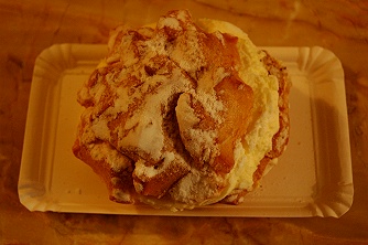 一つがこぶし二つほどの大きさで、ちょっとびっくりですが、あまり甘くない生クリームのおいしさと軽い食感でペロリ。お店による当たり外れが少ないのでお勧めです。お値段はどこでも1ユーロ台。