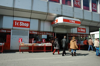 ショッピング歩行街ZEIL の東側の外れにあるUバーンやSバーンのKONSTABLER-WACHE駅そばの広場に立つと、画像の1ユーロ・ショップがすぐ見えます。