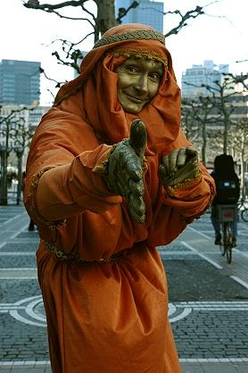 そのパフォーマンスが気に入ったら小銭を入れてあげましょう。画像の人はブロンズ像風の衣装を着けたパントマイム芸人。- 旅行時期