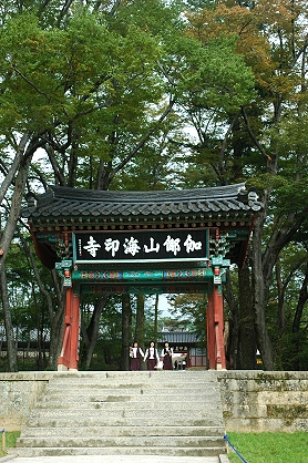 1430mあるという伽耶山の中腹にあるお寺で、一般の駐車場があるあたりからは更に小一時間、徒歩での登りになります。道は舗装されていましたが、地元の人たちは付近の散策も兼ねてのハイキングの格好で来ていました。落ち葉の季節は滑りにくい靴を履いていくのがいいかと思います。