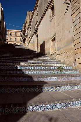 街のほぼ中央の市庁舎そばから、丘の上のサンタ・マリア・デル・モンテ教会下までの142段の階段。