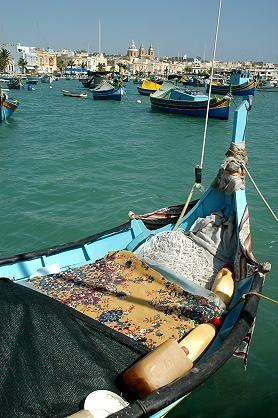 色鮮やかな漁船が港に停泊していますが、どの船にも魔除けの目がへさきに一対付いているのが特徴。