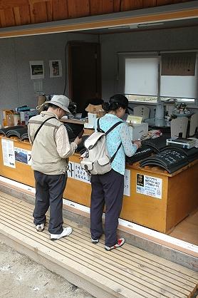 海印寺の山門から登って行くと、黒い大きな瓦をこんなふうに積んだお店が出ています。海印寺に使われる瓦という事で、内外からの参拝者がそれぞれの国の言葉で願い事を書いている風景が見られました。その料金は失念してしまいましたが、参拝の記念に一言書いてみるのもいいかもしれません。