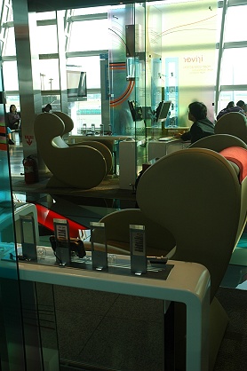 表のガラスの壁にはファースト・クラスと書いてあるので、一瞬ファースト・クラス客用かなと思うのですが、席が空いていれば自由に座って無料で製品を試してみることが出来ます。