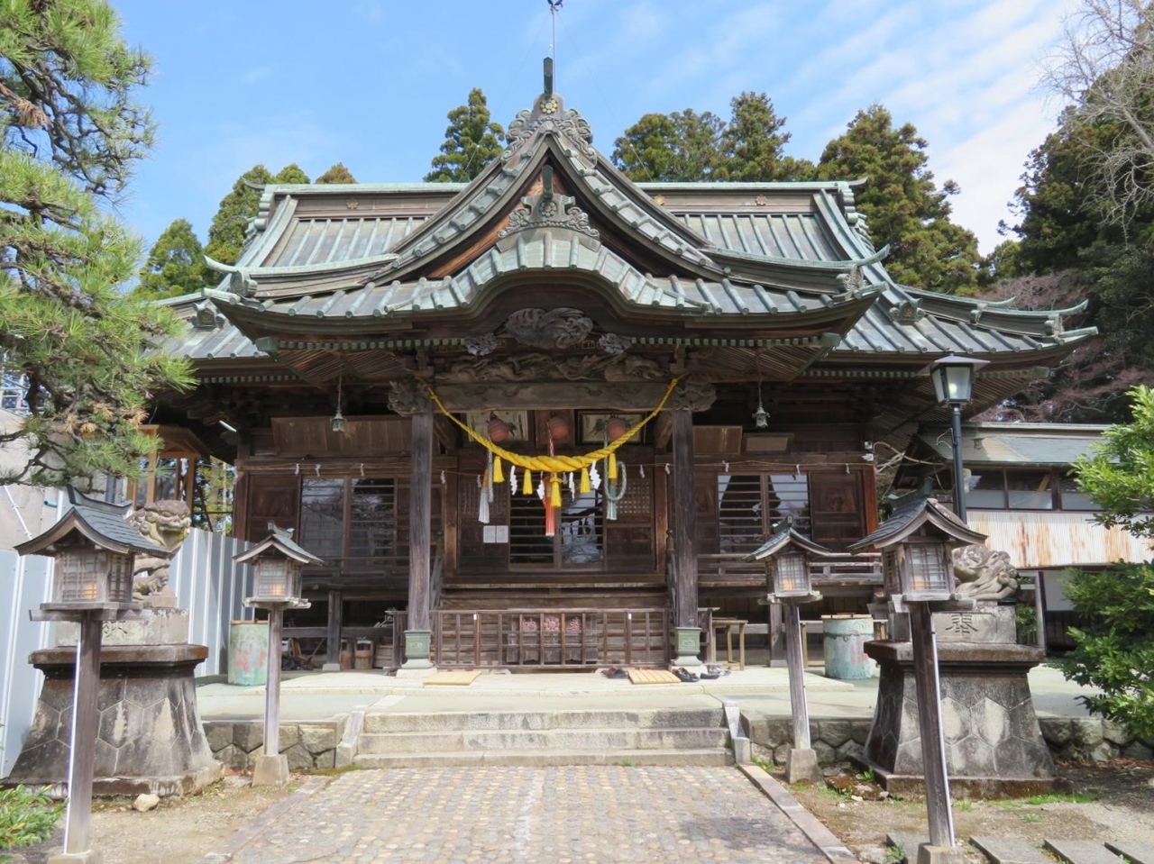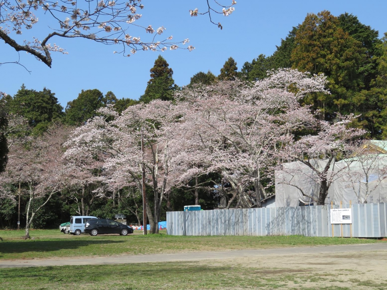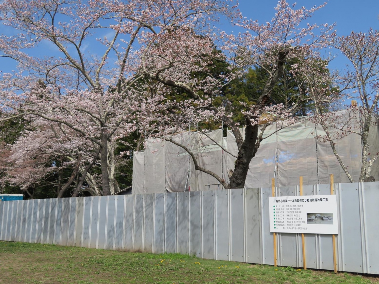 - 2023年3月下旬、本殿などが修復中。境内の桜はほぼ満開でした。