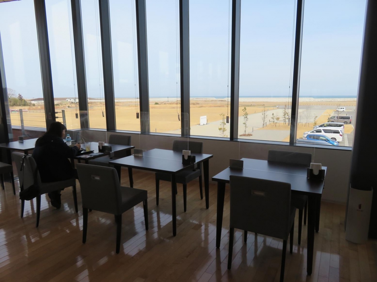 - 新しく広く、奥の席に陣取ると、造成中の福島県復興祈念公園や海が見えます。