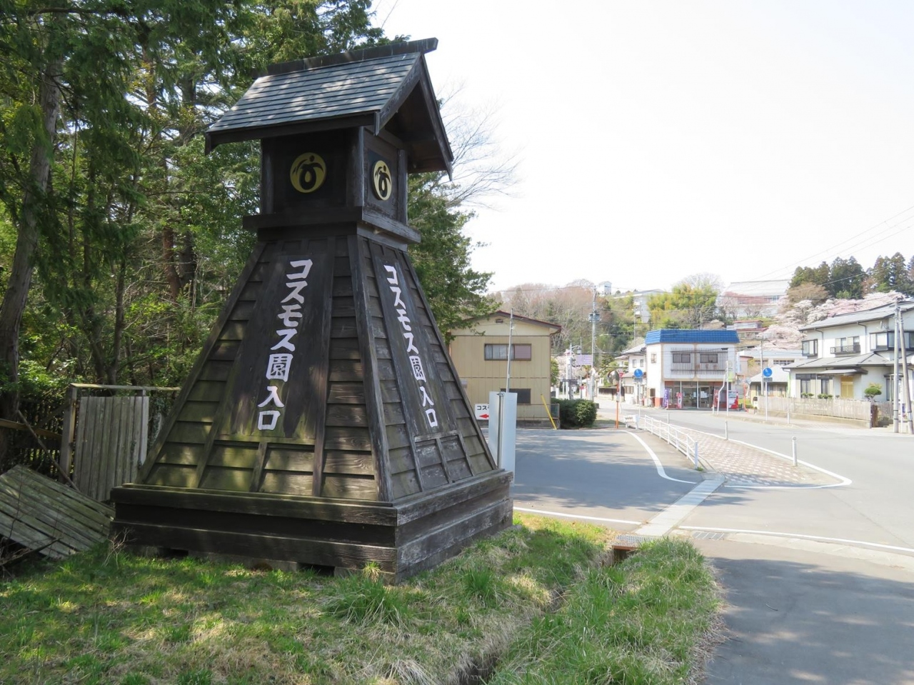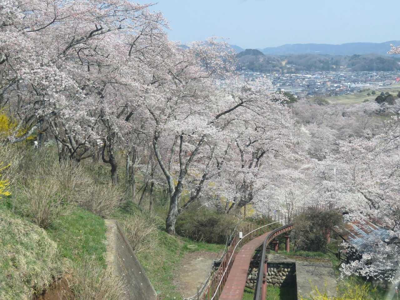 このスロープカー乗り場へは、白石川堤一目千本桜の土手からだと、まず≪しばた千桜橋≫を渡って船岡城址公園へ移動し、さらに≪さくらの里≫への標識に従って行くとスロープカー乗り場がある広場に出ます。