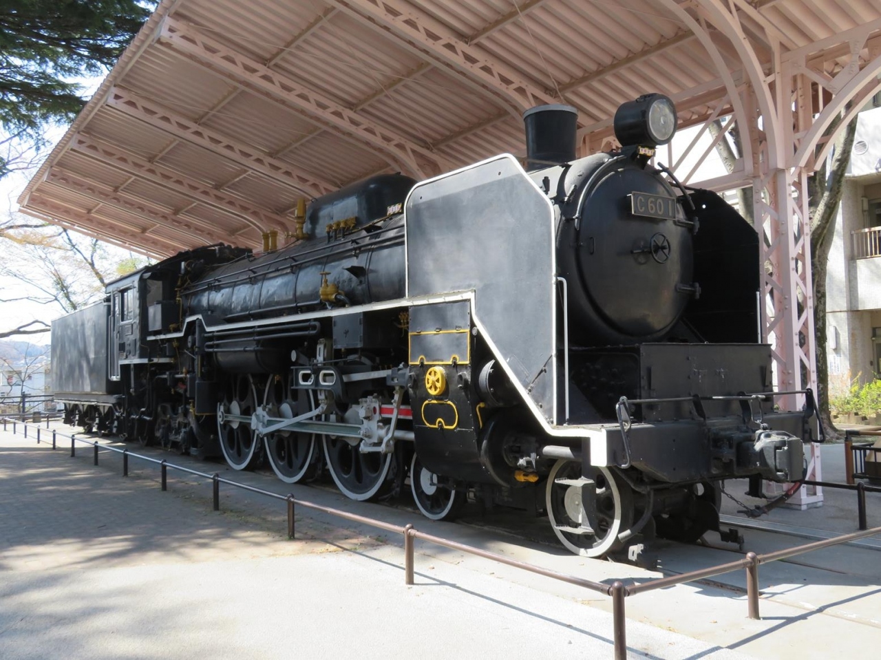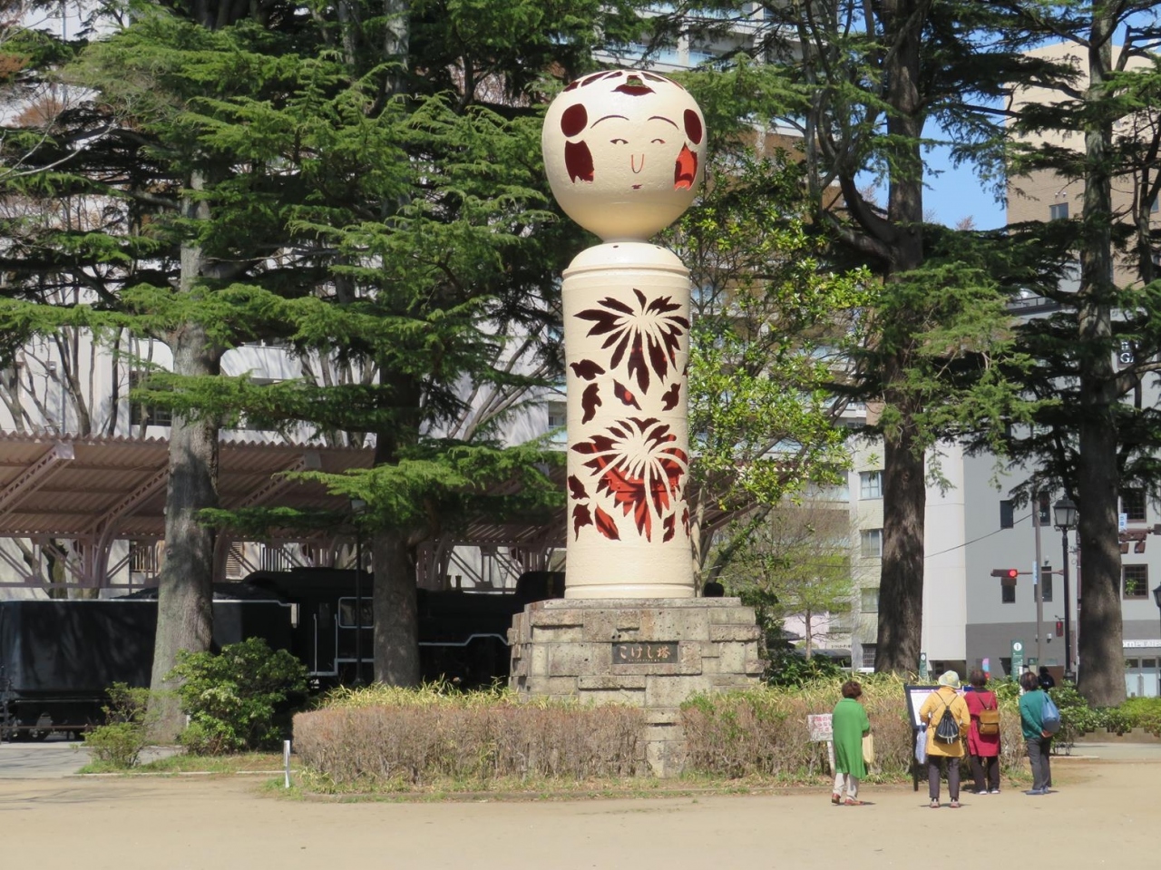 広瀬通りで南北に分断された公園の北側には桜の木は少なく、その代わりに木立が多かったり、こけし像や蒸気機関車C601が置かれています。