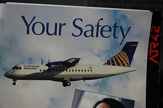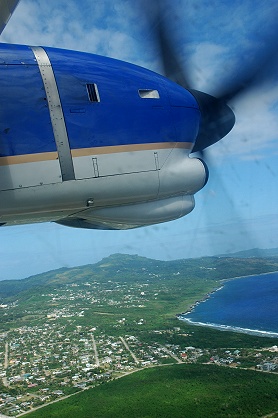私たちはE-チケットで予約していきました。機種はATR42のプロペラ機。真ん中の通路を挟んで二人掛けシートが並んでいます。プロペラが見える位置の座席に座ると、下の風景との取り合わせがいい写真になります。