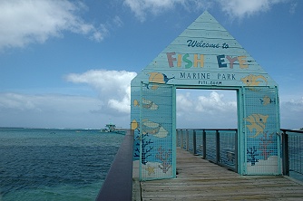 画像はその入り口。チケットはこのゲート脇のブースでどうぞ。地元の人の入場料は10ドルですが、ビジターは16ドル!でも、この橋からの海の色と海中展望台から見る海の底の眺めがいいのでお勧めです。ダイバーが魚の餌付けで窓そばまで寄ってくるのが楽しいアトラクション。大人も子供も楽しめます。
