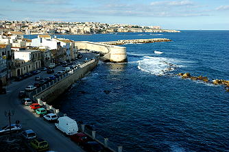 シラクーサのネアポリ考古学公園や新市街を抜けた所にあるオルティジア島は短い橋で結ばれているので、車でもそのまま渡れます。新市街と違ってオルティジア島はほとんどが古い建物の町並み。見所だけではなく、島全体も徒歩で見て歩けるサイズ。