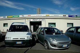 空港ビルの中ではなく、到着ロビーを出て左手に見えるバスなどの発着する広場の向こうに各社入った小さい建物があります。