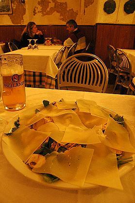画像のサラダはルッコラ+マッシュルーム+パルメザンチーズ。酢とオリーブ油でいただきますが、それぞれの素材に滋味があって深い味でした。ここのピザもお勧めです。サラダをシェアしてピザを二つ、ビール2杯とミネラルウォーターで30ユーロちょっと。