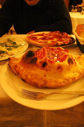 カルツォーネはピザを平たく焼く代わりに、具を中に包んで巨大な餃子のように包み込み焼き上げたヴァリエーション。シチリア島だけではなく、どのピッツェリアでもよく見るメニュー。