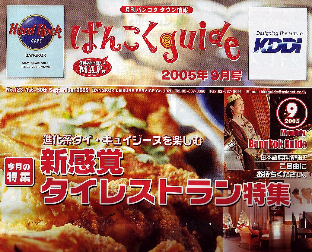 オフィシャル・マップと同じく、ターンテーブル近くに≪ばんこくguide≫という月刊の情報誌が置いてあります。これも無料なのでいただいて役立てましょう。その時々のレストランやお店の情報が満載で重宝します。