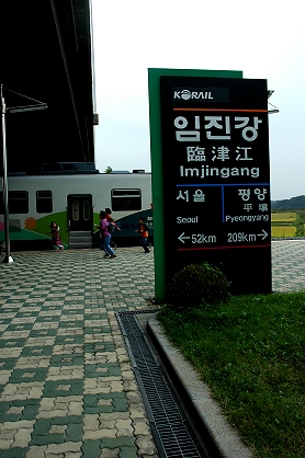北朝鮮を望む烏頭山統一展望台に行く途中に寄ってみました。国境になっている臨津江のすぐ手前の駅。平壌に行く列車は出ていないのですが、こういう標識が立っています。駅を出るとすぐ横に臨津江に面した遊園地があり、家族連れも大勢来ていました。