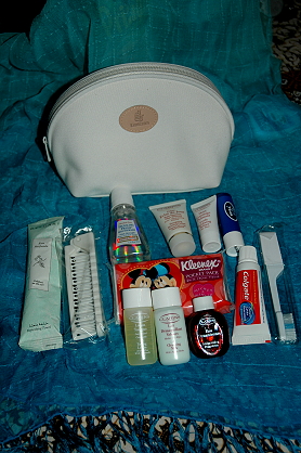 エミレーツ航空を利用したのは05年4月が初めてでした。意匠はいつも同じなのかどうか分かりませんが、アメニティは内容も充実していて、ブラシや歯磨きセットのほかにはティッシュ、香水入りの濡れティッシュ、NIVEAのリップ・クリーム、CLARINSの保湿ローションなどのミニチュア・セットが入っていました。白いポーチもあとで自分でも使いやすい大きさ。これも自分用以外にコレクターの方へのいいお土産になります。