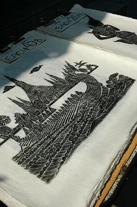 和紙状の紙にさまざまな浮き彫りの拓本を取ったものは昔からあります。これを買って帰って額やランプシェードに仕立てるとアジア調のインテリアが出来上がります。お勧めの絵柄は神々が踊る姿を写したもの。黒以外には茶色、赤っぽい色で写したものもありサイズもいろいろ。画像の中の大きいものは60×40cmほどで45バーツの言い値。