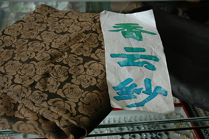 中国伝統模様の派手派手しいシルク生地や藍染の布のほかにも画像のような≪香云紗≫という生地が売られています。