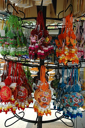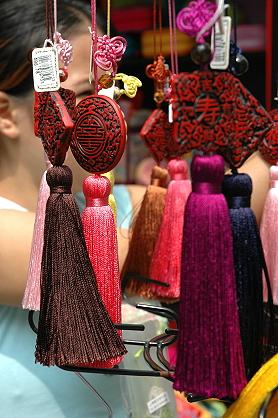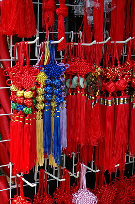 豫園の庭園周辺のお土産屋さんでよく見かける、中国結びをアレンジした携帯ストラップや飾り物。これは飾り物の方で長さが20センチほど。長くて大きいのだと1メートル位にもなりますが、ちょっとしたお土産にはこの位の物がちょうどいいかも。色も本来の赤以外にも増えてきています。