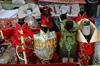 中国伝統柄の布地を使った小物類も豫園の庭園周辺のお土産屋さんでよく見かけます。巾着型の袋から、ポーチ、お財布、ティッシュ・カバー、スリッパ、バッグ…、などなど。洋酒類の可愛いボトル・カバーも健在。画像のようにデザインも豊富になりました。どれも言い値5元程度~。