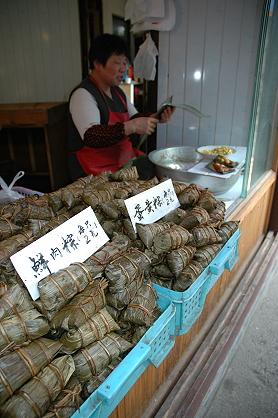 上海郊外にある水郷≪朱家角≫には細長い形の粽を売るお店も多数。