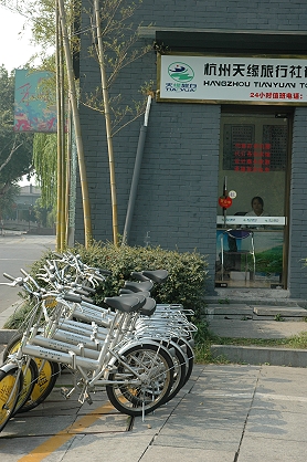 一日かけて西湖周辺を回ってみたい時には、西湖の南山路沿いにこんな旅行社兼貸し自転車屋もあるので、まずは徒歩でのお散歩の時に要チェック。