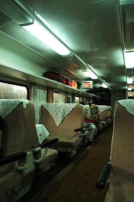画像は下の階の軟座。駅構内に入っている時に撮ったので、暗く見えますが、大きめのゆったりした座席です。