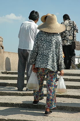 上海市内にある水郷≪朱家角≫の放生橋の辺りでは、ビニール袋に数匹の魚を入れて売り歩く、こんなおじさんやおばさんをよく見かけます。