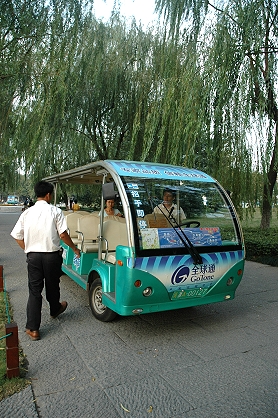 西湖を取り巻く遊歩道を画像のような車が多数走っています。これはどの場所でも手を挙げて、席が空いていれば乗れる仕組みになっています。